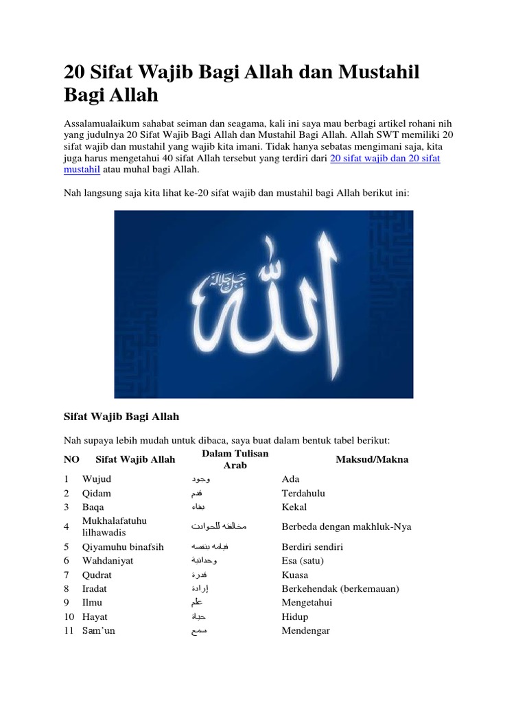 Sifat allah ta'ala yang pertama adalah wujud yang berarti ada tabel 20 sifat wajib allah dan artinya. Dengan mengenali 20 sifat wajib dan 20 sifat mustahil allah, sebagai umat islam kita dapat lebih menguatkan keimanan terhadap allah swt.